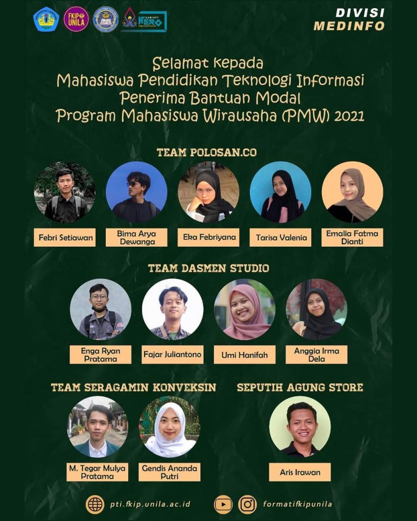 Program Mahasiswa Wirausaha (PMW) sebagai salah satu program Direktorat Jenderal Pendidikan Tinggi (Dikti) bertujuan mendorong mahasiswa menumbuhkan minat dan kreativitasnya di bidang kewirausahaan. Universitas Lampung (Unila) berikan dukungan kepada 1.000 mahasiswa Unila untuk menjadi wirausaha. (Dikutip dari : https://www.unila.ac.id/unila-dukung-1-000-mahasiswa-wirausaha/ ) Dan beberapa tim mahasiswa dari PTI berhasil mendapatkan kesempatan tersebut. Selamat kepada para anggota tim […]